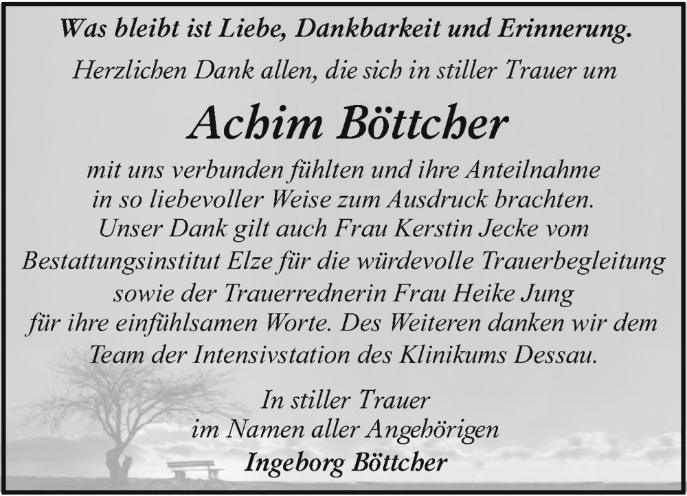 Hier finden Sie alle Traueranzeigen aus der Zeitung, die bisher für Achim Böttcher erschienen sind. Weitere Traueranzeigen, die in der Zeitung erscheinen, werden hier ebenfalls aufgelistet