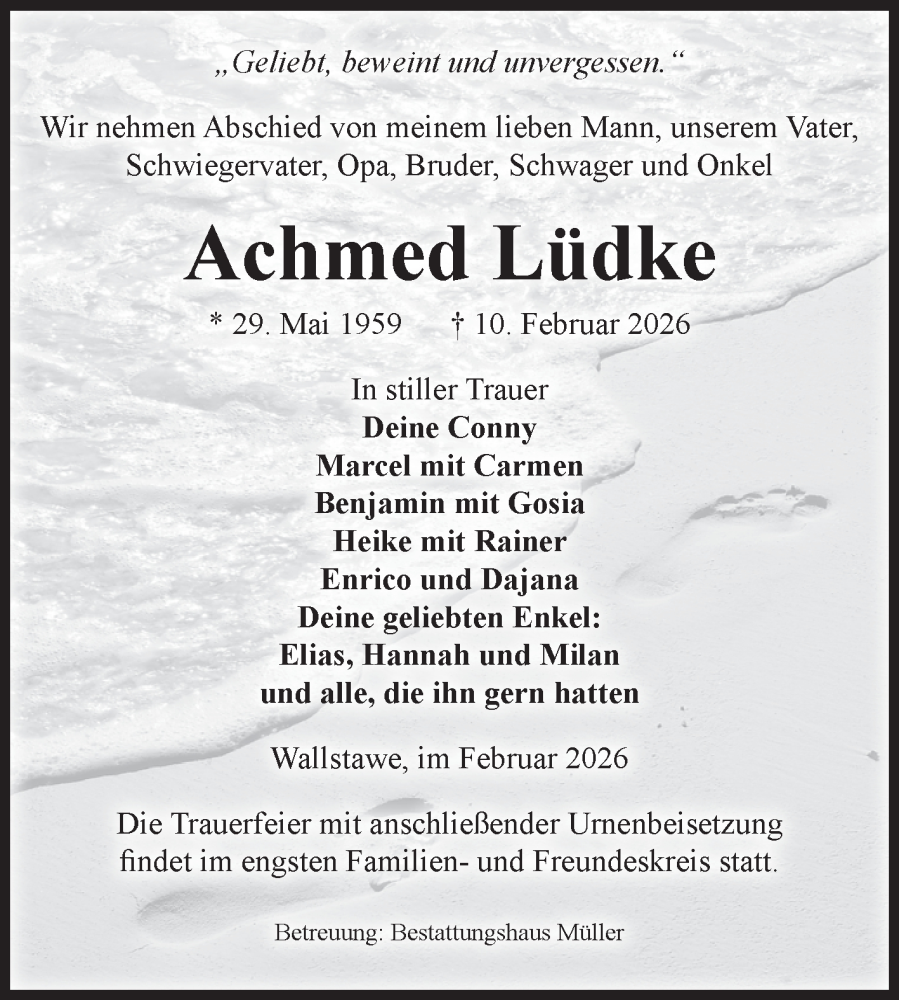 Hier finden Sie alle Traueranzeigen aus der Zeitung, die bisher für Achmed Lüdke erschienen sind. Weitere Traueranzeigen, die in der Zeitung erscheinen, werden hier ebenfalls aufgelistet