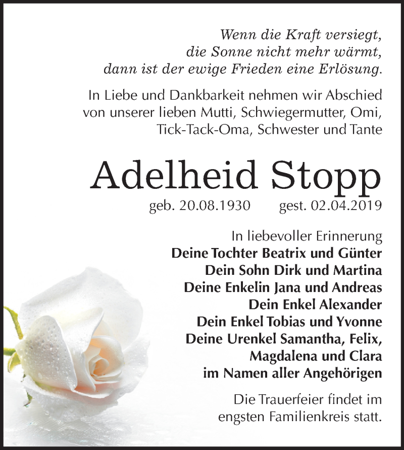 Hier finden Sie alle Traueranzeigen aus der Zeitung, die bisher für Adelheid Stopp erschienen sind. Weitere Traueranzeigen, die in der Zeitung erscheinen, werden hier ebenfalls aufgelistet