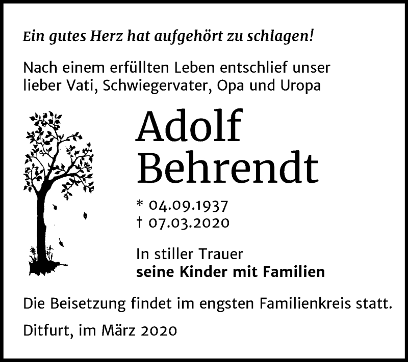 Hier finden Sie alle Traueranzeigen aus der Zeitung, die bisher für Adolf Behrendt erschienen sind. Weitere Traueranzeigen, die in der Zeitung erscheinen, werden hier ebenfalls aufgelistet