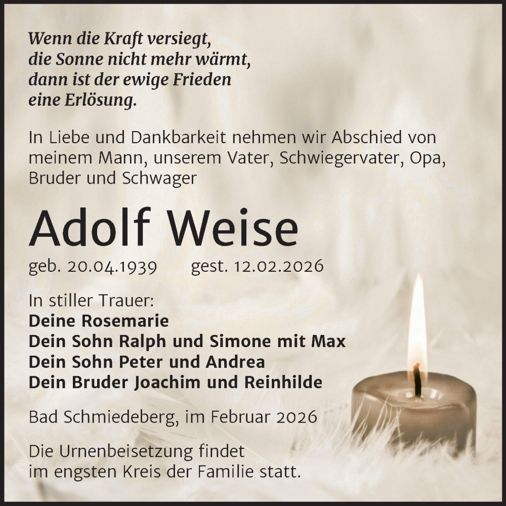 Hier finden Sie alle Traueranzeigen aus der Zeitung, die bisher für Adolf Weise erschienen sind. Weitere Traueranzeigen, die in der Zeitung erscheinen, werden hier ebenfalls aufgelistet