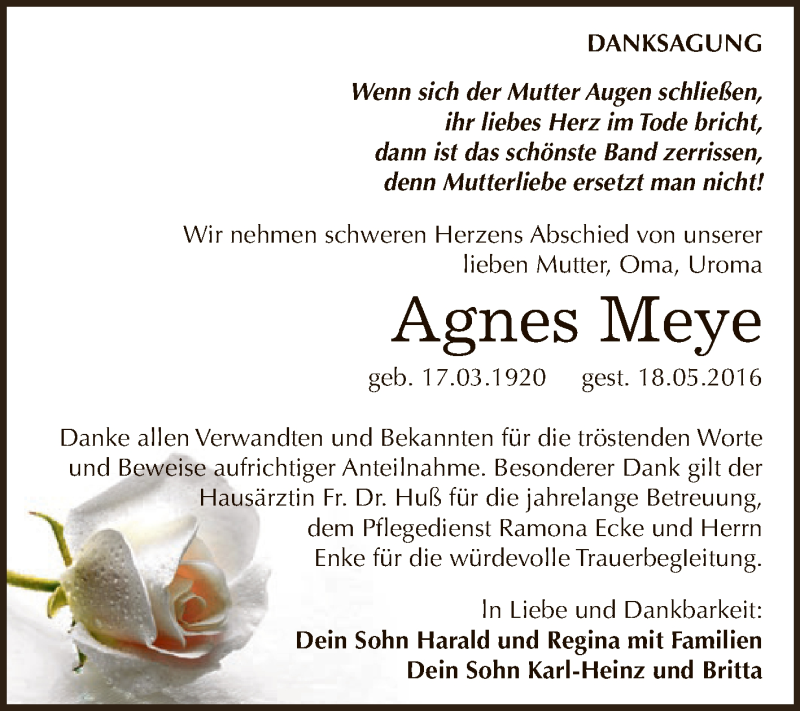 Hier finden Sie alle Traueranzeigen aus der Zeitung, die bisher für Agnes Meye erschienen sind. Weitere Traueranzeigen, die in der Zeitung erscheinen, werden hier ebenfalls aufgelistet