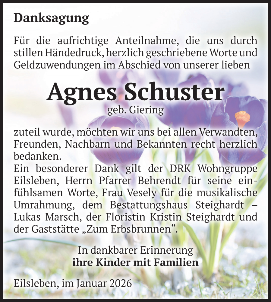Hier finden Sie alle Traueranzeigen aus der Zeitung, die bisher für Agnes Schuster erschienen sind. Weitere Traueranzeigen, die in der Zeitung erscheinen, werden hier ebenfalls aufgelistet