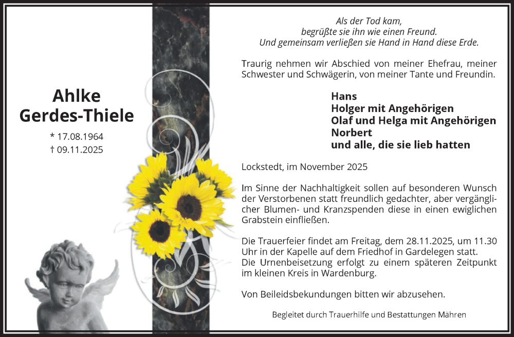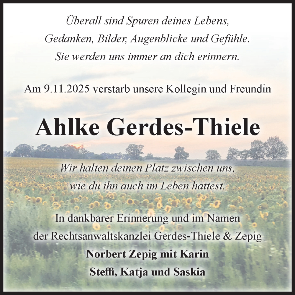 Hier finden Sie alle Traueranzeigen aus der Zeitung, die bisher für Ahlke Gerdes-Thiele erschienen sind. Weitere Traueranzeigen, die in der Zeitung erscheinen, werden hier ebenfalls aufgelistet