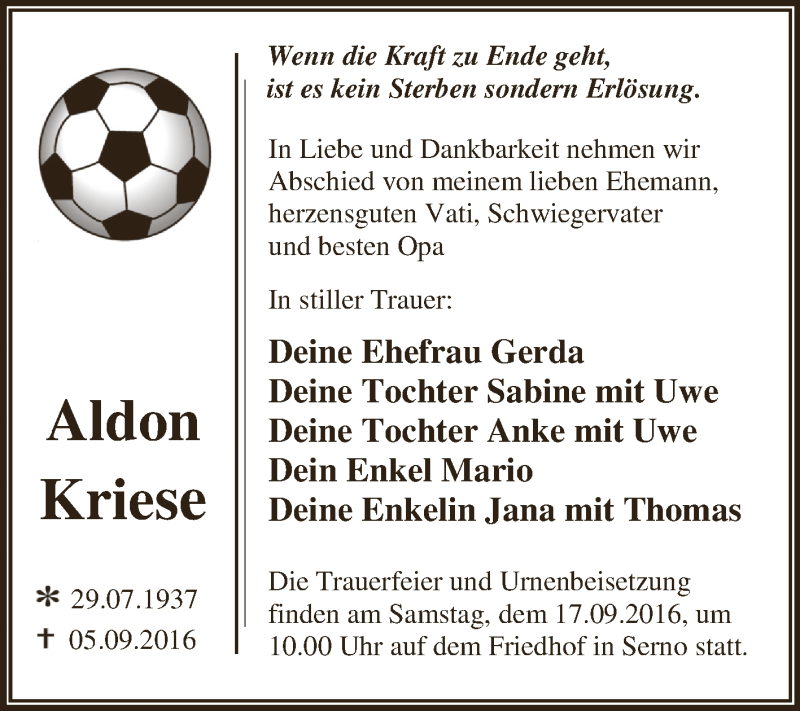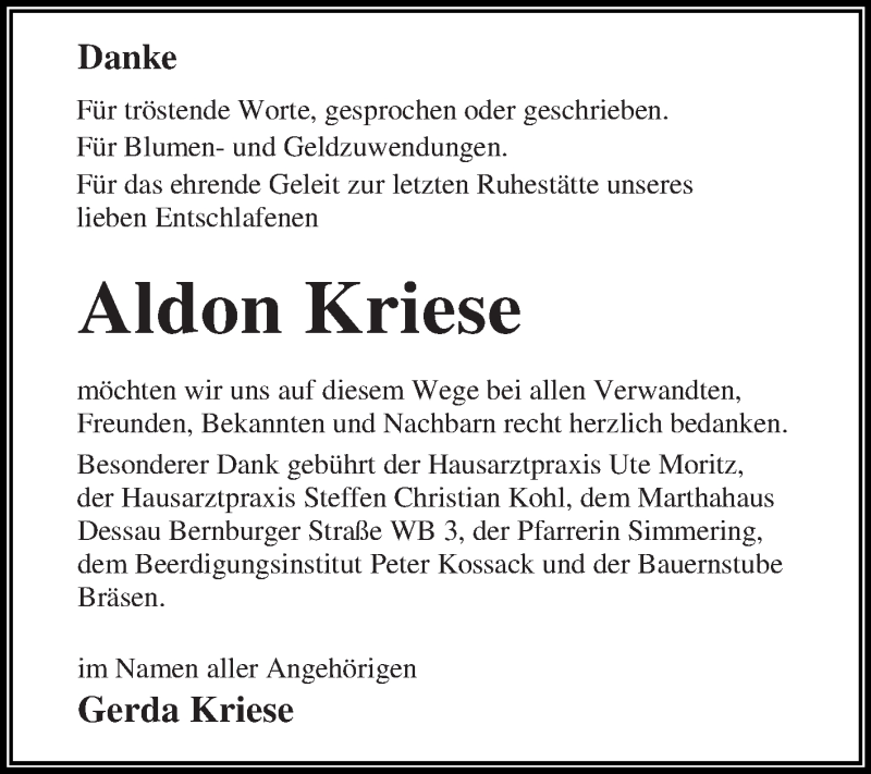 Hier finden Sie alle Traueranzeigen aus der Zeitung, die bisher für Aldon Kriese erschienen sind. Weitere Traueranzeigen, die in der Zeitung erscheinen, werden hier ebenfalls aufgelistet