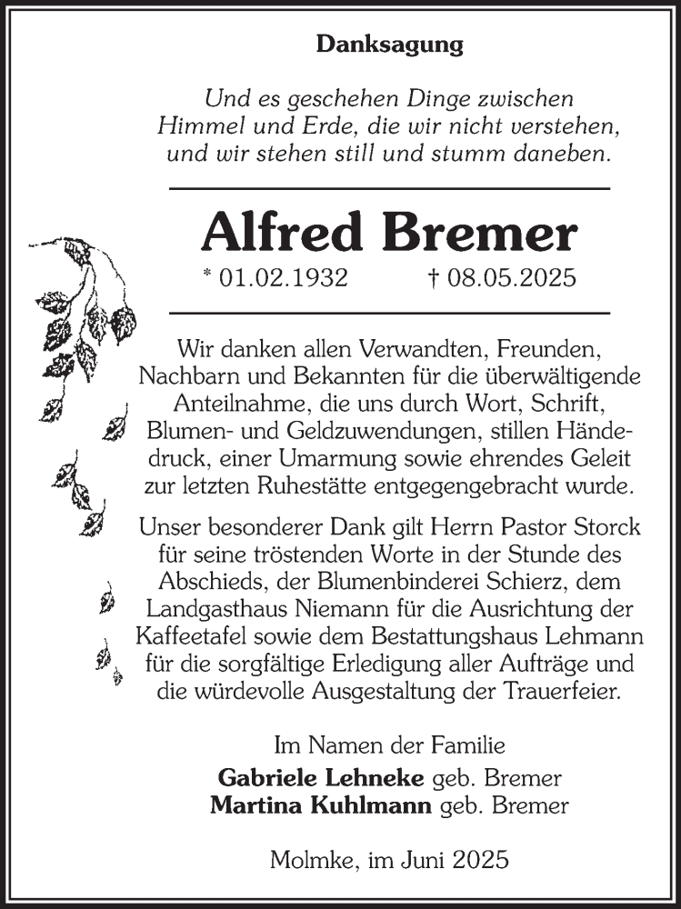Hier finden Sie alle Traueranzeigen aus der Zeitung, die bisher für Alfred Bremer erschienen sind. Weitere Traueranzeigen, die in der Zeitung erscheinen, werden hier ebenfalls aufgelistet