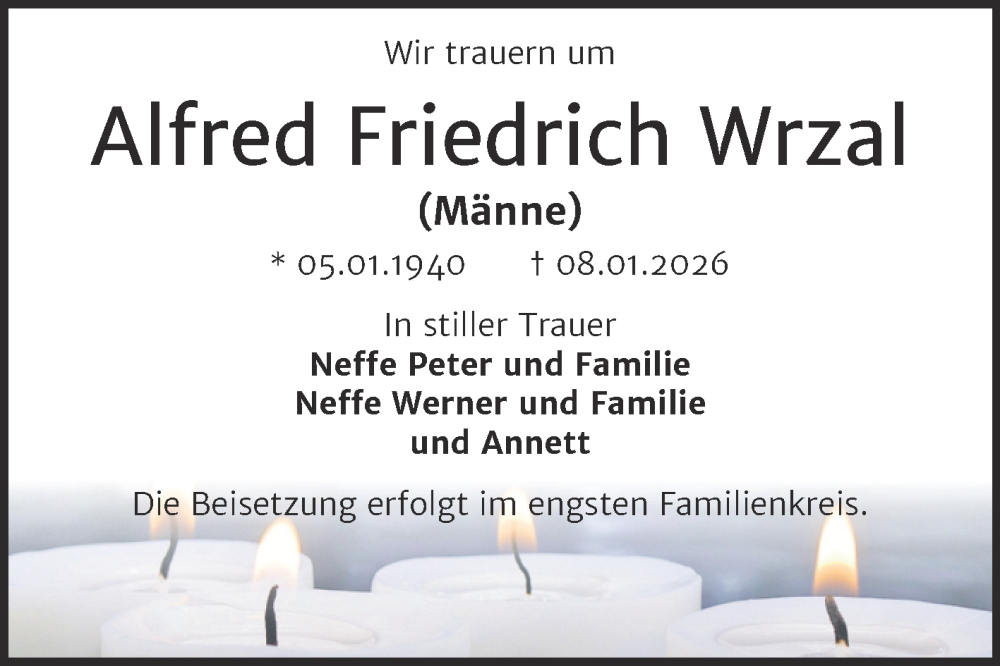 Hier finden Sie alle Traueranzeigen aus der Zeitung, die bisher für Alfred Friedrich Wrzal erschienen sind. Weitere Traueranzeigen, die in der Zeitung erscheinen, werden hier ebenfalls aufgelistet