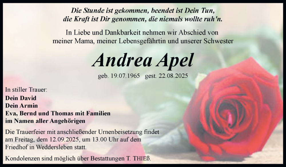 Hier finden Sie alle Traueranzeigen aus der Zeitung, die bisher für Andrea Apel erschienen sind. Weitere Traueranzeigen, die in der Zeitung erscheinen, werden hier ebenfalls aufgelistet