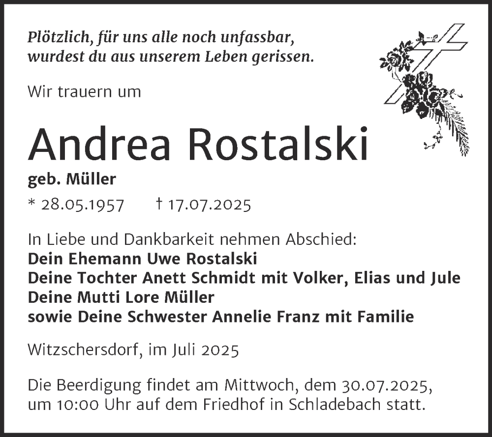 Hier finden Sie alle Traueranzeigen aus der Zeitung, die bisher für Andrea Rostalski erschienen sind. Weitere Traueranzeigen, die in der Zeitung erscheinen, werden hier ebenfalls aufgelistet