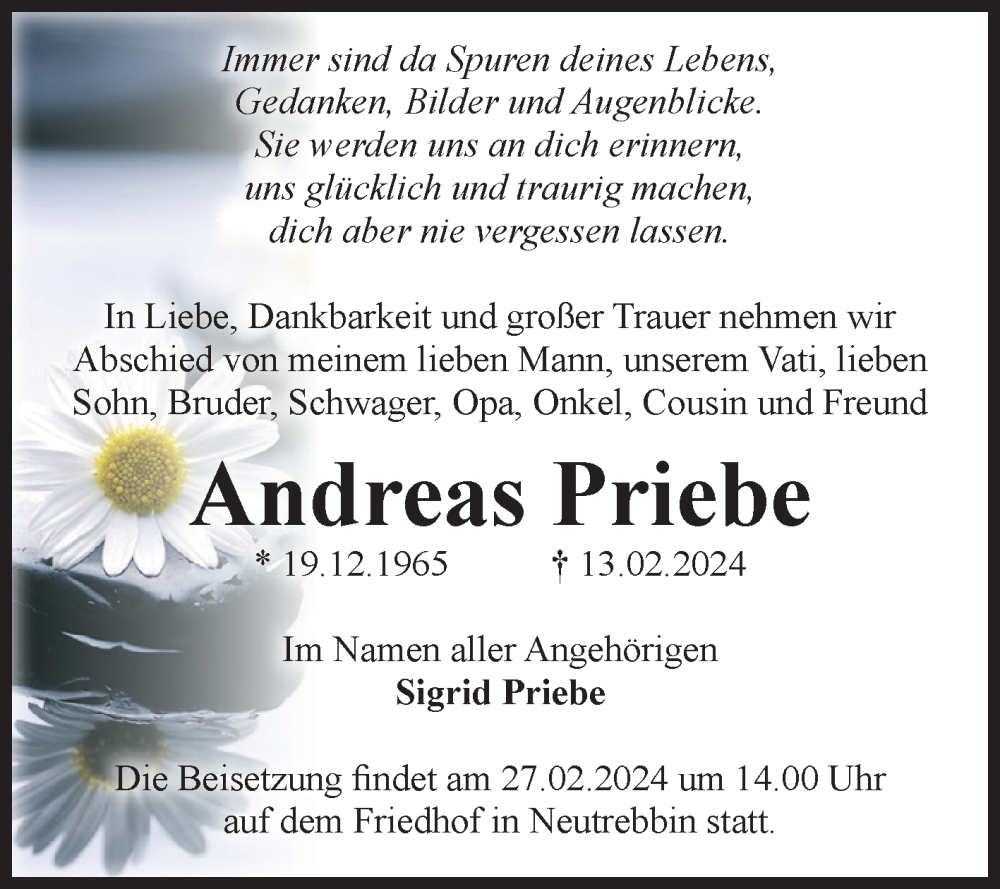 Hier finden Sie alle Traueranzeigen aus der Zeitung, die bisher für Andreas Priebe erschienen sind. Weitere Traueranzeigen, die in der Zeitung erscheinen, werden hier ebenfalls aufgelistet