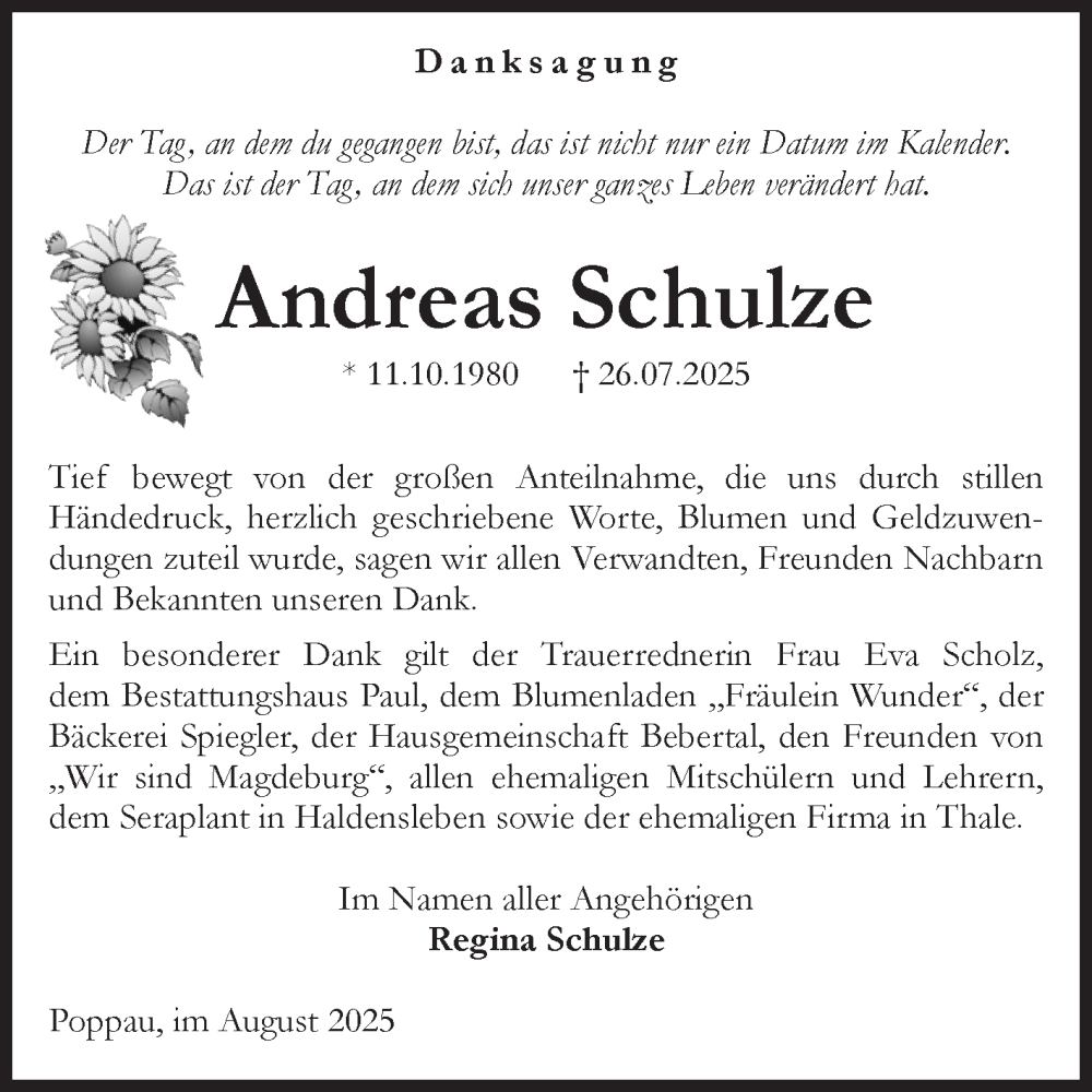 Hier finden Sie alle Traueranzeigen aus der Zeitung, die bisher für Andreas Schulze erschienen sind. Weitere Traueranzeigen, die in der Zeitung erscheinen, werden hier ebenfalls aufgelistet