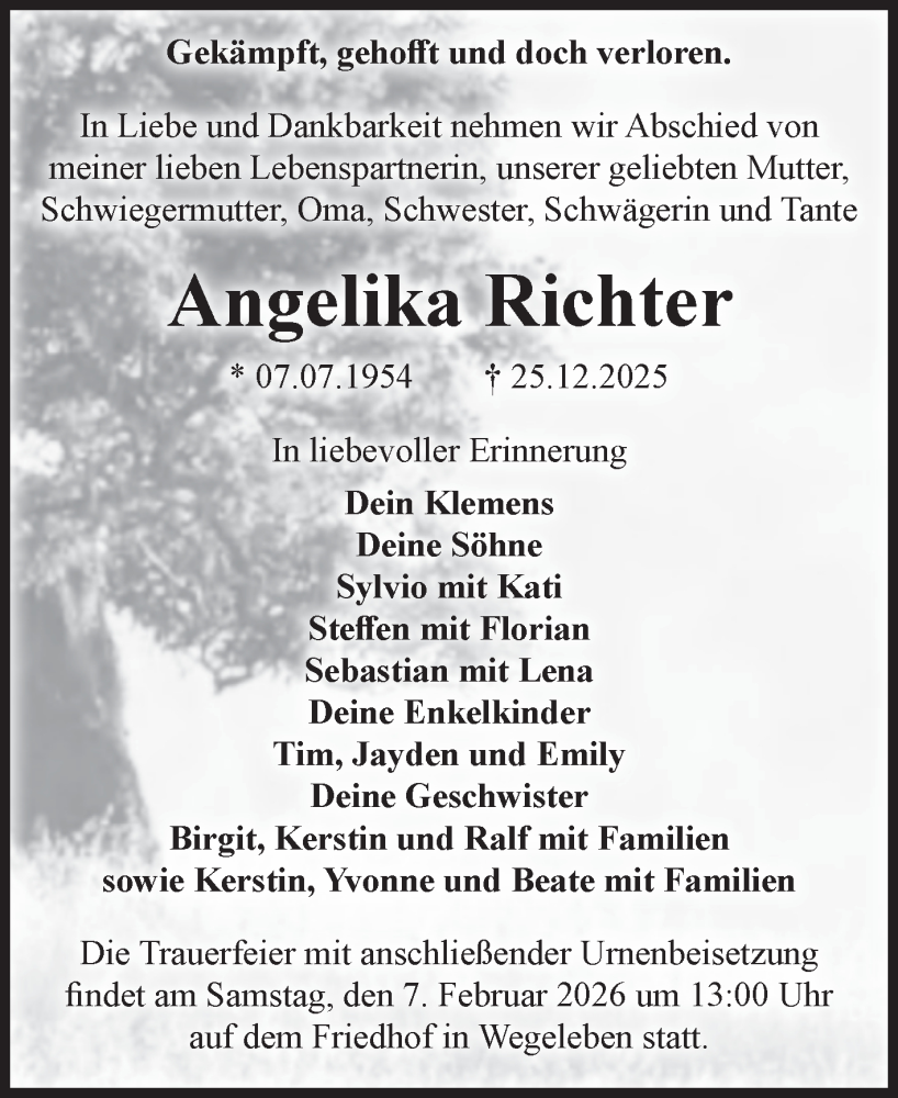 Hier finden Sie alle Traueranzeigen aus der Zeitung, die bisher für Angelika Richter erschienen sind. Weitere Traueranzeigen, die in der Zeitung erscheinen, werden hier ebenfalls aufgelistet