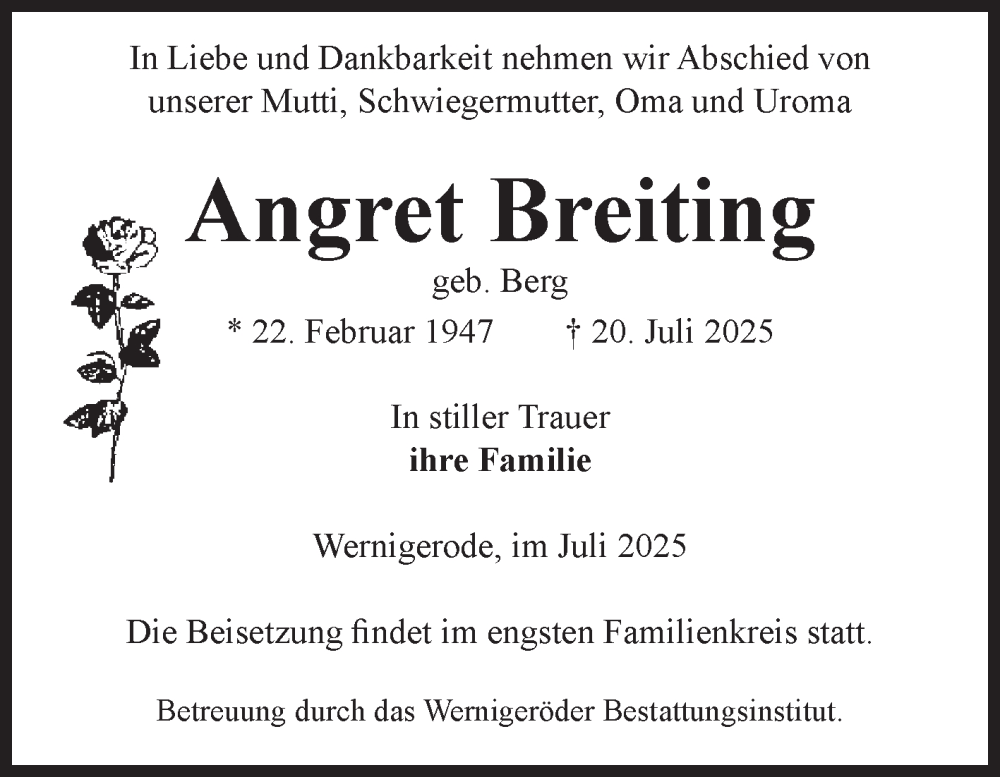 Hier finden Sie alle Traueranzeigen aus der Zeitung, die bisher für Angret Breiting erschienen sind. Weitere Traueranzeigen, die in der Zeitung erscheinen, werden hier ebenfalls aufgelistet