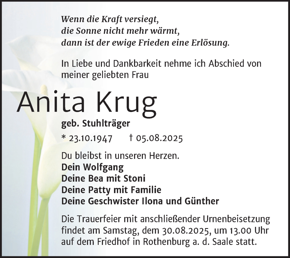 Hier finden Sie alle Traueranzeigen aus der Zeitung, die bisher für Anita Krug erschienen sind. Weitere Traueranzeigen, die in der Zeitung erscheinen, werden hier ebenfalls aufgelistet