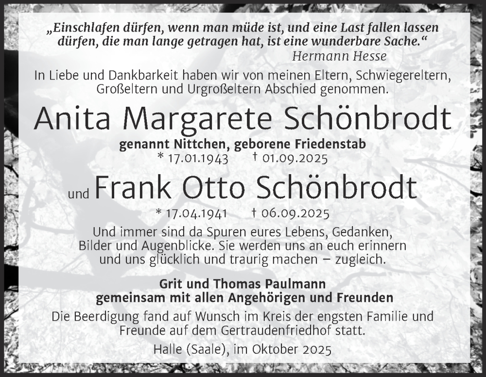 Hier finden Sie alle Traueranzeigen aus der Zeitung, die bisher für Anita Margarete Schönbrodt erschienen sind. Weitere Traueranzeigen, die in der Zeitung erscheinen, werden hier ebenfalls aufgelistet
