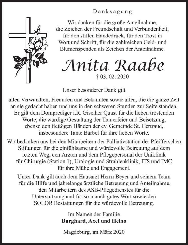 Hier finden Sie alle Traueranzeigen aus der Zeitung, die bisher für Anita Raabe erschienen sind. Weitere Traueranzeigen, die in der Zeitung erscheinen, werden hier ebenfalls aufgelistet