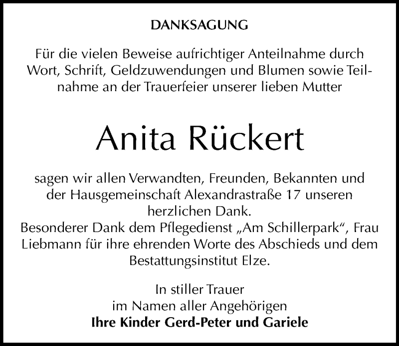 Hier finden Sie alle Traueranzeigen aus der Zeitung, die bisher für Anita Rückert erschienen sind. Weitere Traueranzeigen, die in der Zeitung erscheinen, werden hier ebenfalls aufgelistet