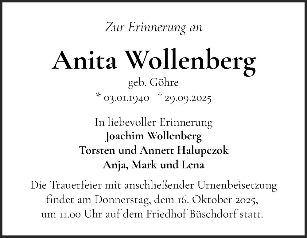 Hier finden Sie alle Traueranzeigen aus der Zeitung, die bisher für Anita Wollenberg erschienen sind. Weitere Traueranzeigen, die in der Zeitung erscheinen, werden hier ebenfalls aufgelistet