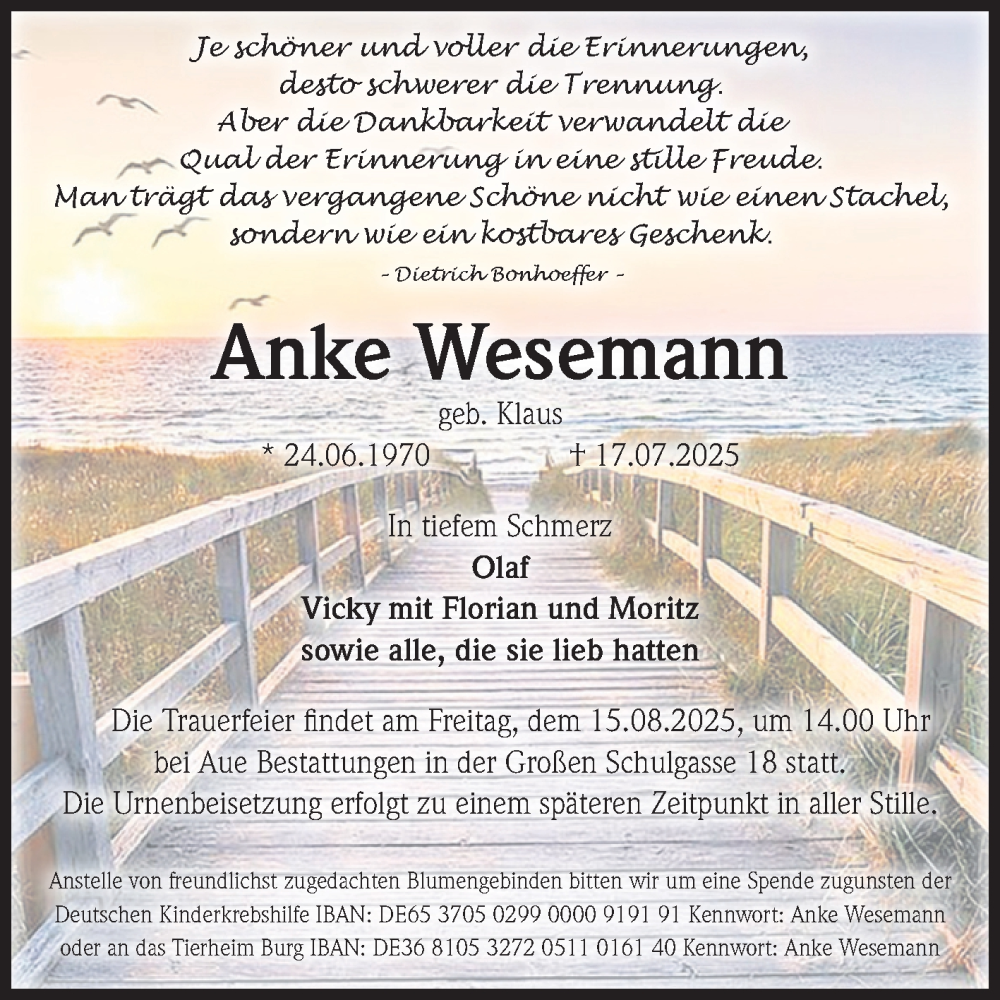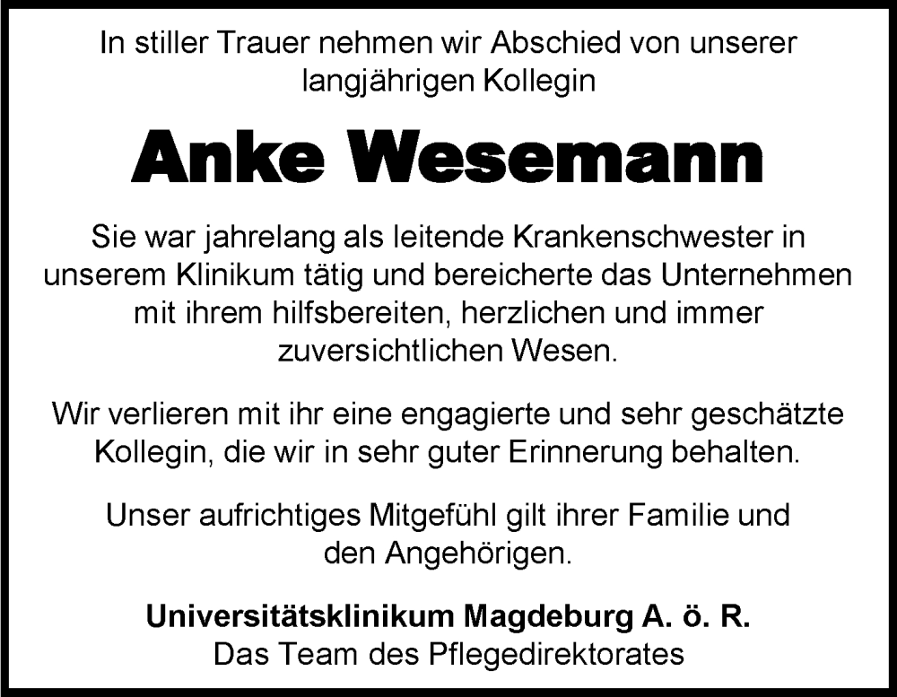 Hier finden Sie alle Traueranzeigen aus der Zeitung, die bisher für Anke Wesemann erschienen sind. Weitere Traueranzeigen, die in der Zeitung erscheinen, werden hier ebenfalls aufgelistet