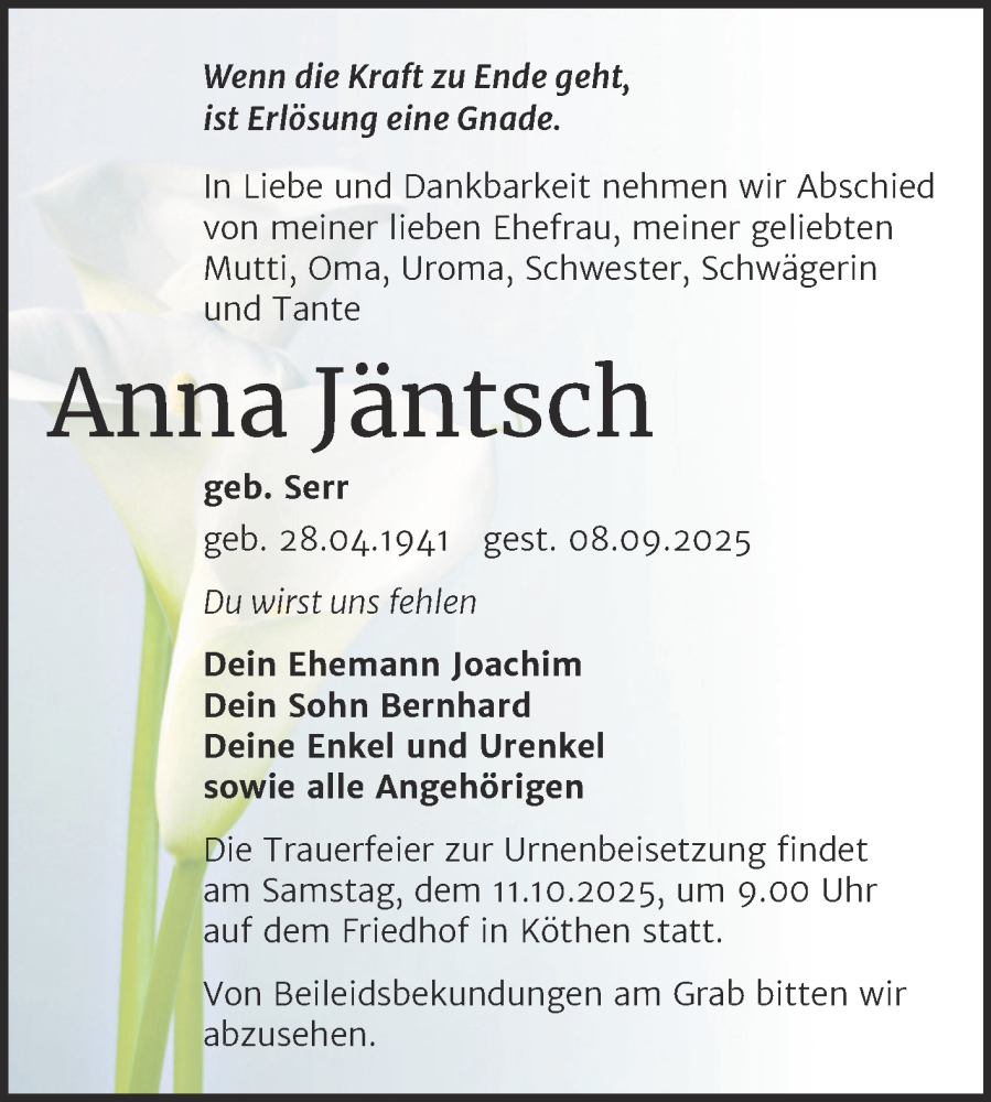 Hier finden Sie alle Traueranzeigen aus der Zeitung, die bisher für Anna Jäntsch erschienen sind. Weitere Traueranzeigen, die in der Zeitung erscheinen, werden hier ebenfalls aufgelistet