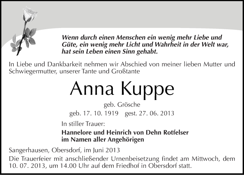 Hier finden Sie alle Traueranzeigen aus der Zeitung, die bisher für Anna Kuppe erschienen sind. Weitere Traueranzeigen, die in der Zeitung erscheinen, werden hier ebenfalls aufgelistet
