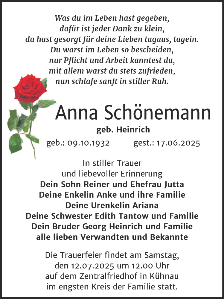 Hier finden Sie alle Traueranzeigen aus der Zeitung, die bisher für Anna Schönemann erschienen sind. Weitere Traueranzeigen, die in der Zeitung erscheinen, werden hier ebenfalls aufgelistet