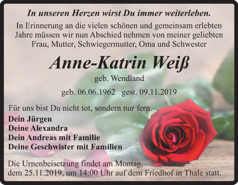 Hier finden Sie alle Traueranzeigen aus der Zeitung, die bisher für Anne-Katrin Weiß erschienen sind. Weitere Traueranzeigen, die in der Zeitung erscheinen, werden hier ebenfalls aufgelistet