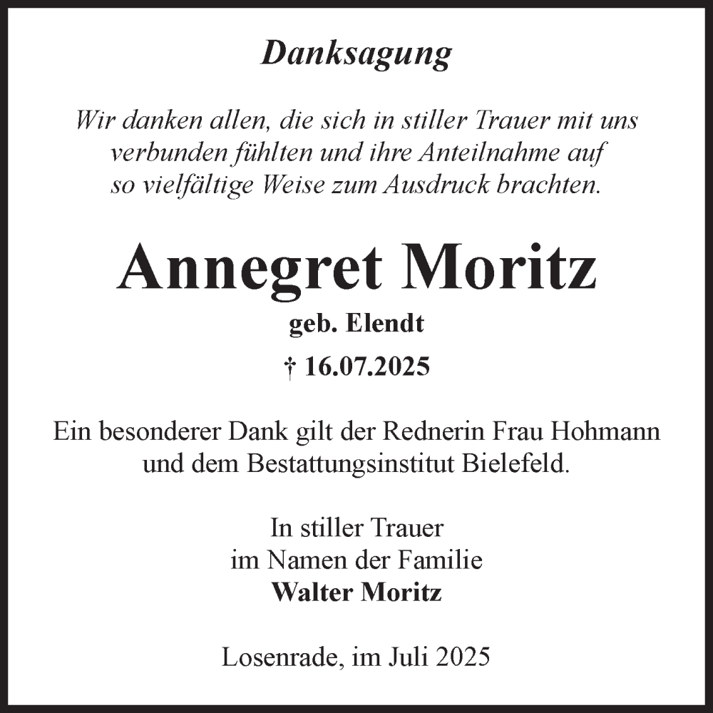 Hier finden Sie alle Traueranzeigen aus der Zeitung, die bisher für Annegret Moritz erschienen sind. Weitere Traueranzeigen, die in der Zeitung erscheinen, werden hier ebenfalls aufgelistet