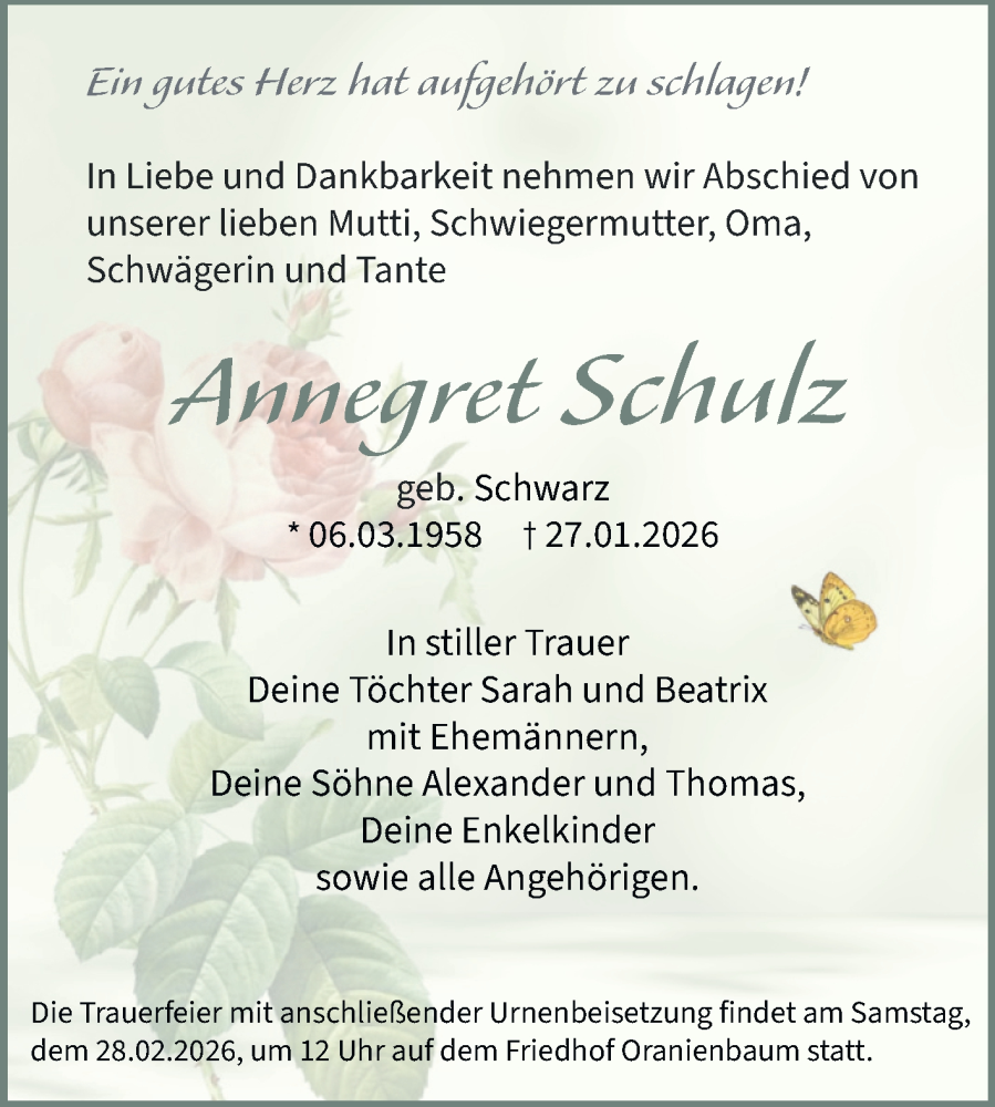 Hier finden Sie alle Traueranzeigen aus der Zeitung, die bisher für Annegret Schulz erschienen sind. Weitere Traueranzeigen, die in der Zeitung erscheinen, werden hier ebenfalls aufgelistet