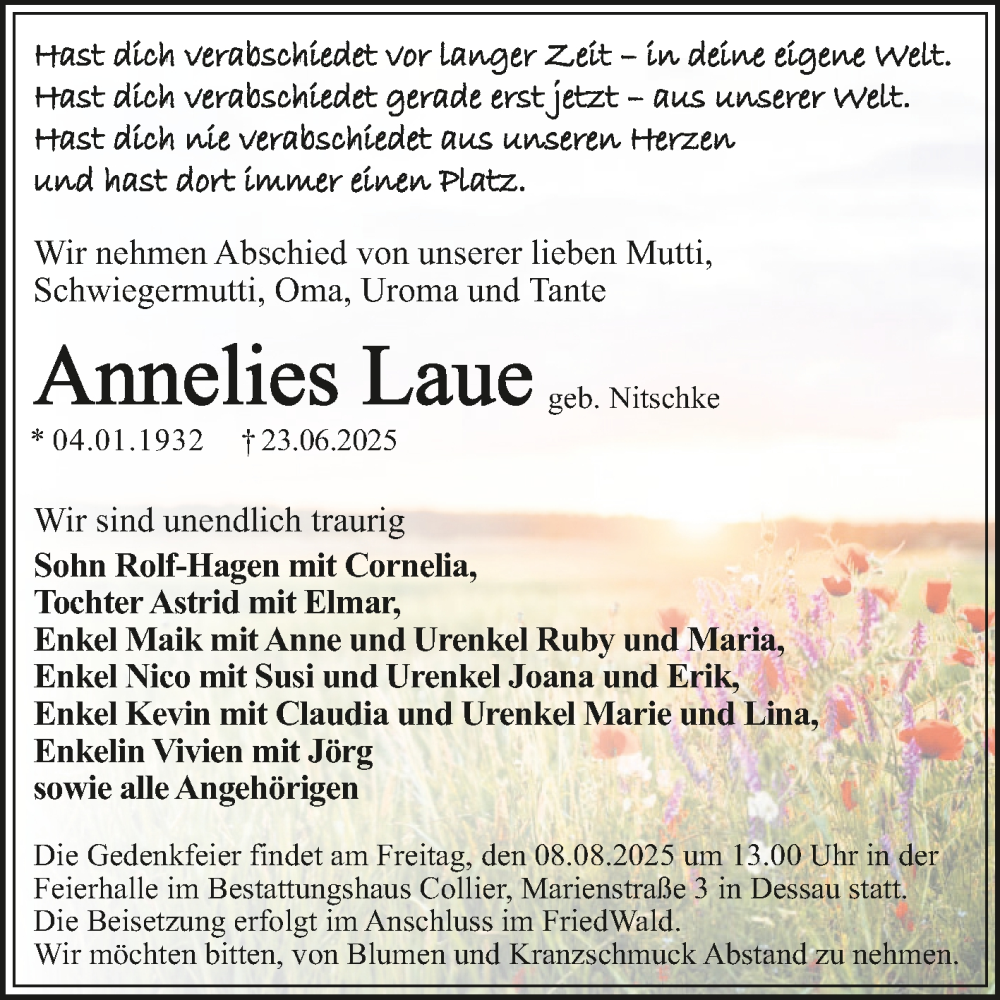 Hier finden Sie alle Traueranzeigen aus der Zeitung, die bisher für Annelies Laue erschienen sind. Weitere Traueranzeigen, die in der Zeitung erscheinen, werden hier ebenfalls aufgelistet