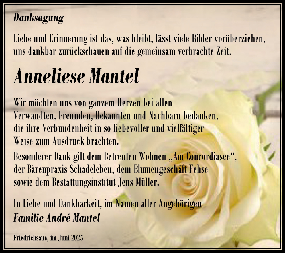 Hier finden Sie alle Traueranzeigen aus der Zeitung, die bisher für Anneliese Mantel erschienen sind. Weitere Traueranzeigen, die in der Zeitung erscheinen, werden hier ebenfalls aufgelistet