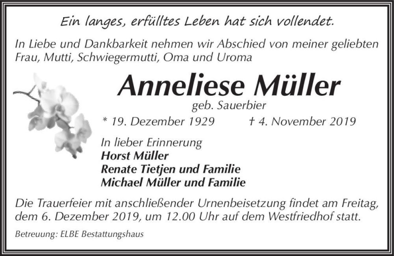 Hier finden Sie alle Traueranzeigen aus der Zeitung, die bisher für Anneliese Müller (geb. Sauerbier) erschienen sind. Weitere Traueranzeigen, die in der Zeitung erscheinen, werden hier ebenfalls aufgelistet