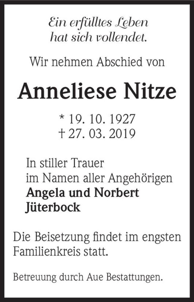 Hier finden Sie alle Traueranzeigen aus der Zeitung, die bisher für Anneliese Nitze erschienen sind. Weitere Traueranzeigen, die in der Zeitung erscheinen, werden hier ebenfalls aufgelistet