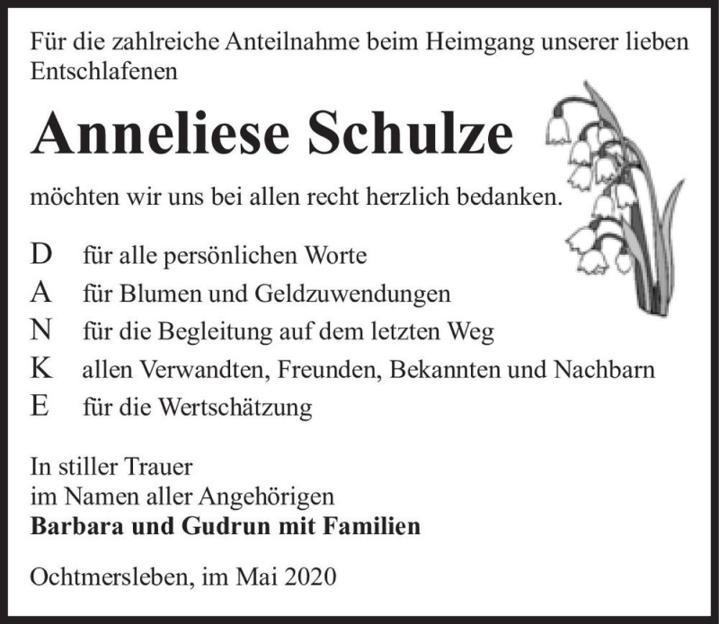 Hier finden Sie alle Traueranzeigen aus der Zeitung, die bisher für Anneliese Schulze erschienen sind. Weitere Traueranzeigen, die in der Zeitung erscheinen, werden hier ebenfalls aufgelistet