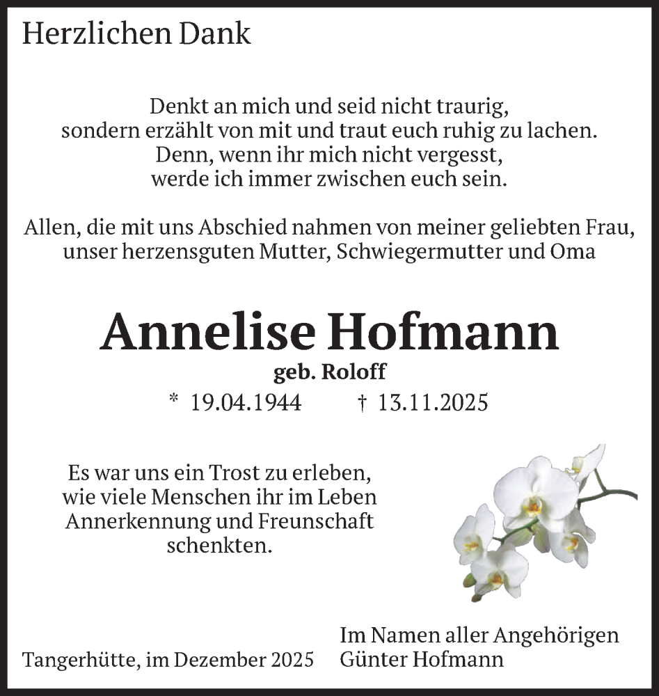Hier finden Sie alle Traueranzeigen aus der Zeitung, die bisher für Annelise Hofmann erschienen sind. Weitere Traueranzeigen, die in der Zeitung erscheinen, werden hier ebenfalls aufgelistet