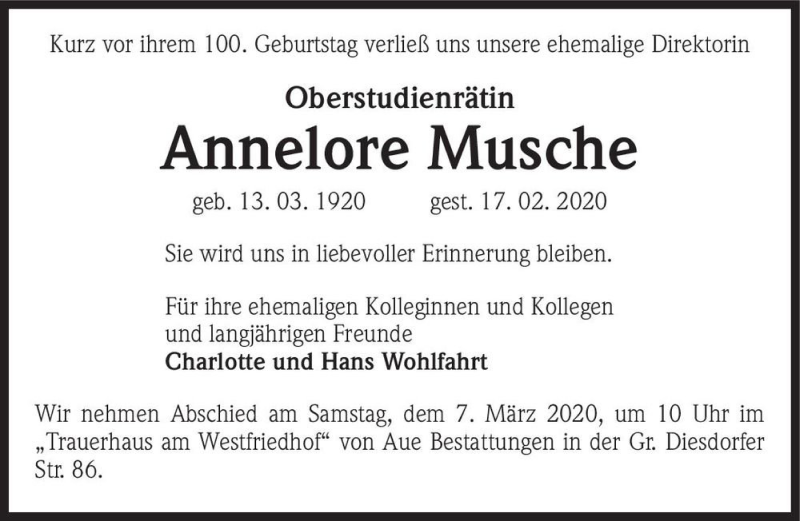 Hier finden Sie alle Traueranzeigen aus der Zeitung, die bisher für Annelore Musche erschienen sind. Weitere Traueranzeigen, die in der Zeitung erscheinen, werden hier ebenfalls aufgelistet