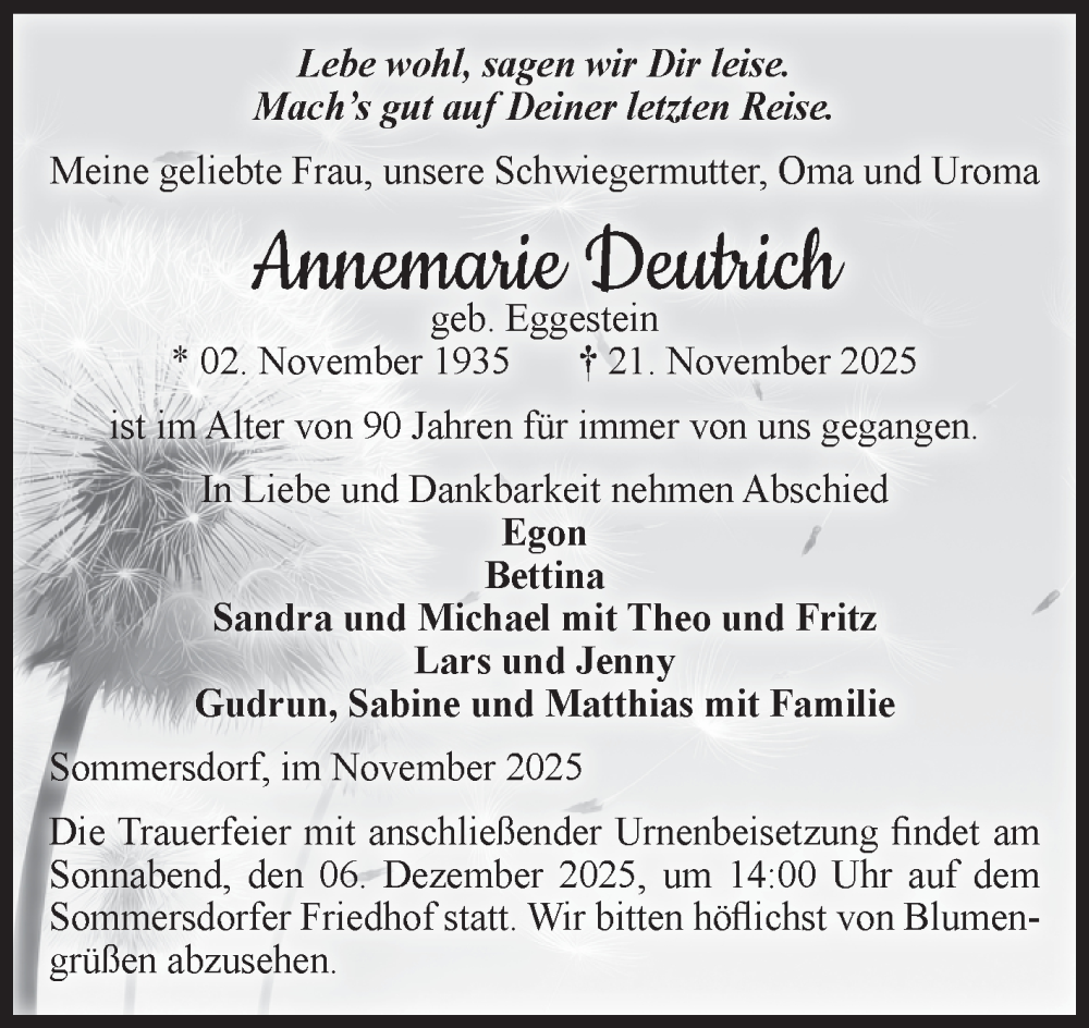 Hier finden Sie alle Traueranzeigen aus der Zeitung, die bisher für Annemarie Deutrich erschienen sind. Weitere Traueranzeigen, die in der Zeitung erscheinen, werden hier ebenfalls aufgelistet