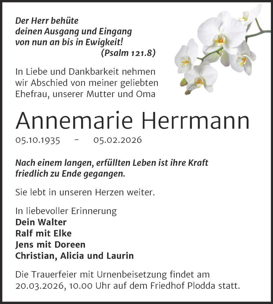 Hier finden Sie alle Traueranzeigen aus der Zeitung, die bisher für Annemarie Herrmann erschienen sind. Weitere Traueranzeigen, die in der Zeitung erscheinen, werden hier ebenfalls aufgelistet