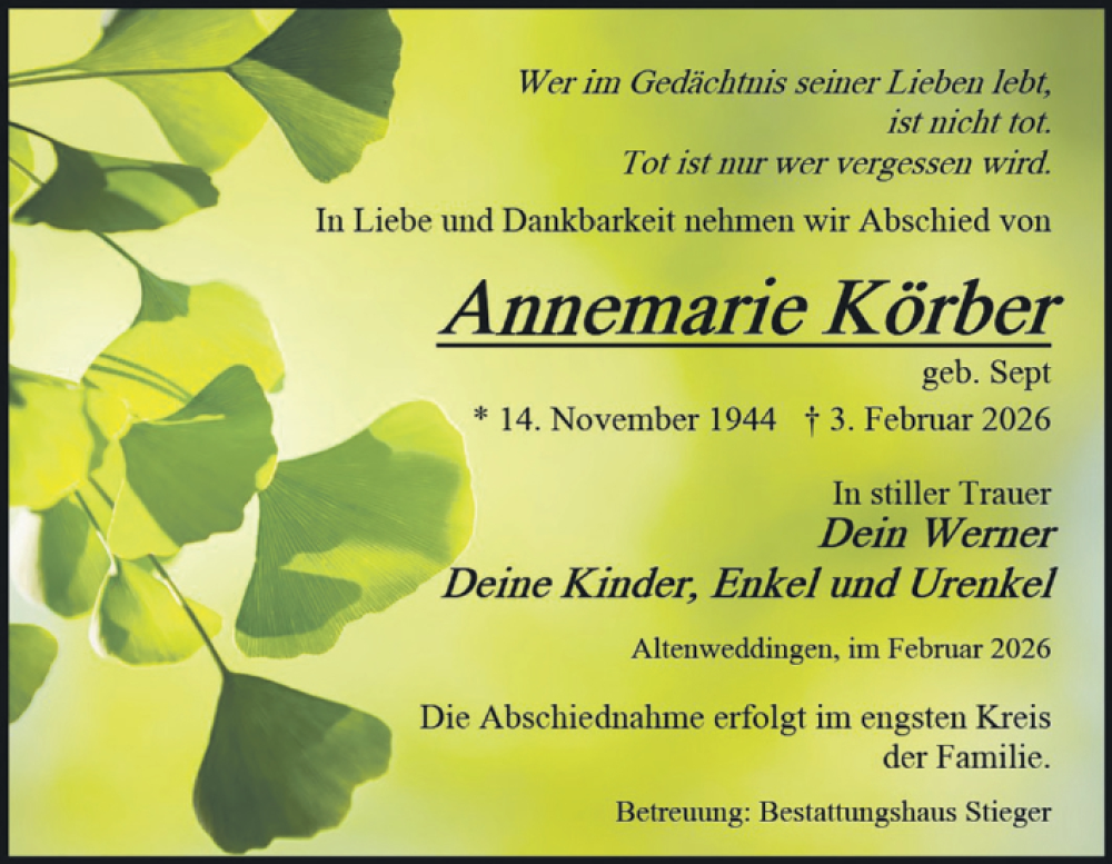 Hier finden Sie alle Traueranzeigen aus der Zeitung, die bisher für Annemarie Körber erschienen sind. Weitere Traueranzeigen, die in der Zeitung erscheinen, werden hier ebenfalls aufgelistet