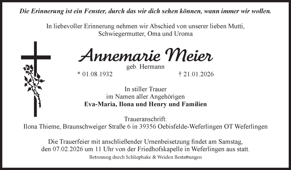 Hier finden Sie alle Traueranzeigen aus der Zeitung, die bisher für Annemarie Meier erschienen sind. Weitere Traueranzeigen, die in der Zeitung erscheinen, werden hier ebenfalls aufgelistet