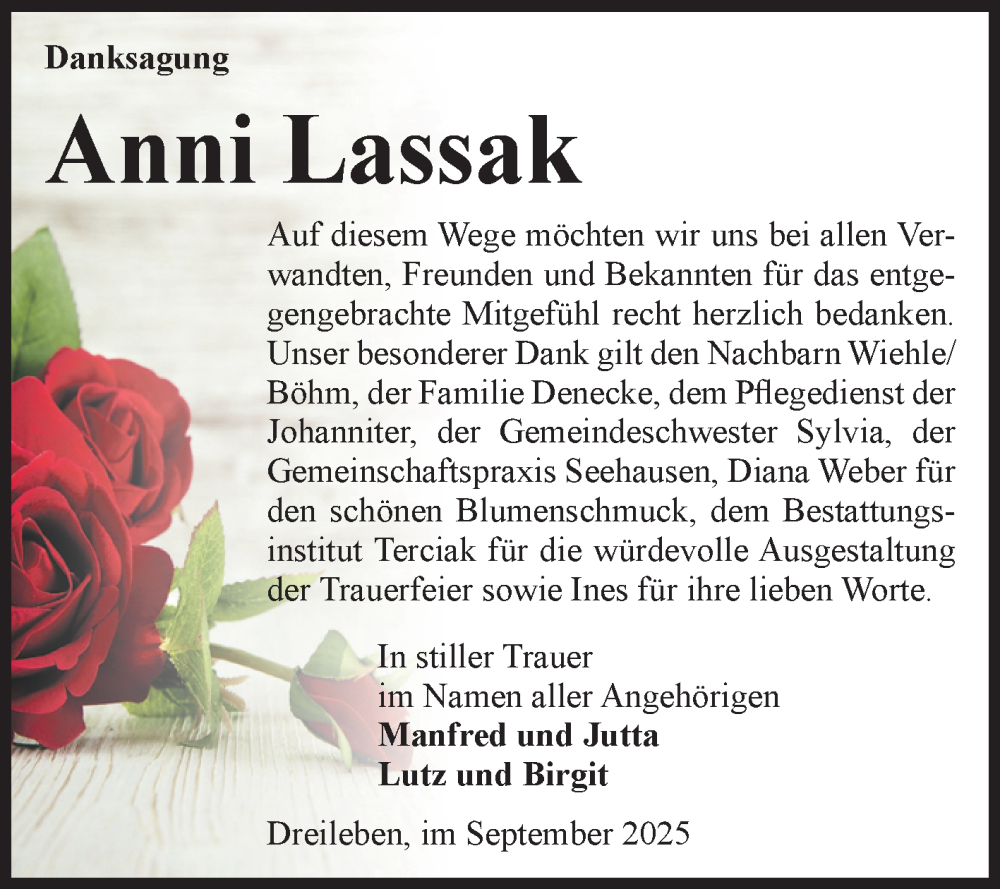 Hier finden Sie alle Traueranzeigen aus der Zeitung, die bisher für Anni Lassak erschienen sind. Weitere Traueranzeigen, die in der Zeitung erscheinen, werden hier ebenfalls aufgelistet