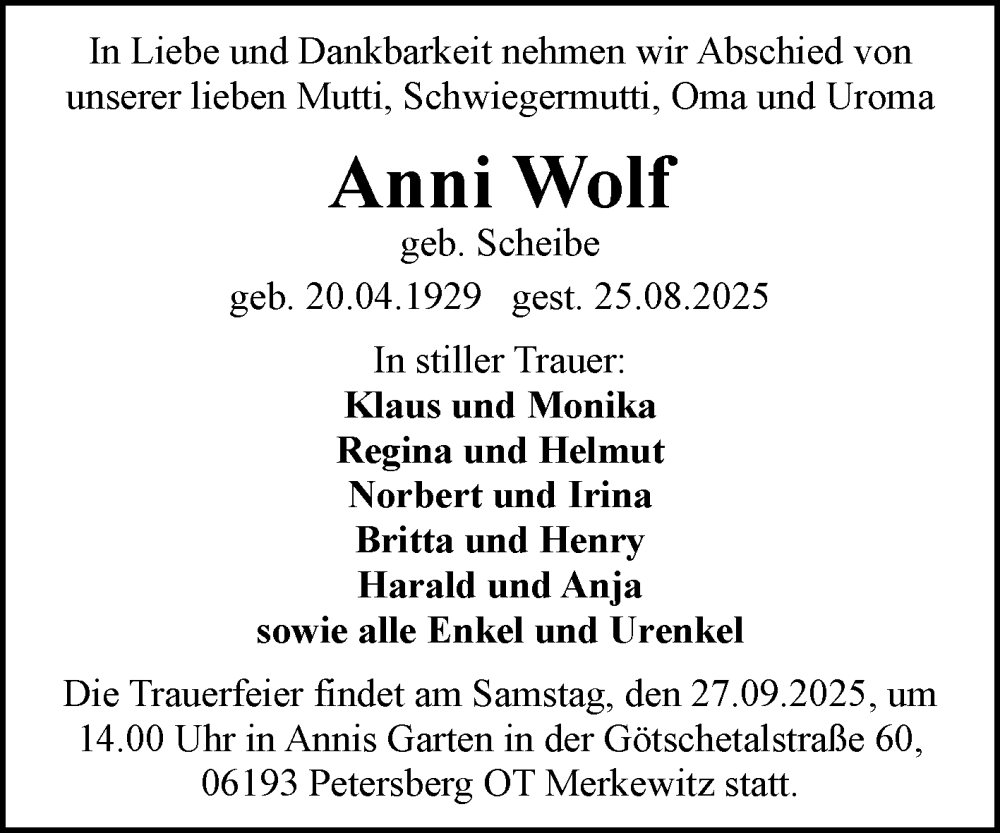 Hier finden Sie alle Traueranzeigen aus der Zeitung, die bisher für Anni Wolf erschienen sind. Weitere Traueranzeigen, die in der Zeitung erscheinen, werden hier ebenfalls aufgelistet