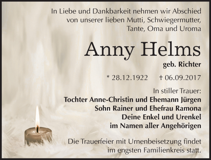 Hier finden Sie alle Traueranzeigen aus der Zeitung, die bisher für Anny Helms erschienen sind. Weitere Traueranzeigen, die in der Zeitung erscheinen, werden hier ebenfalls aufgelistet