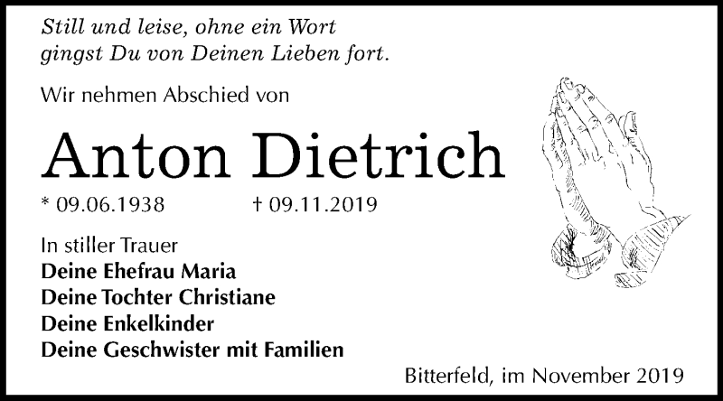 Hier finden Sie alle Traueranzeigen aus der Zeitung, die bisher für Anton Dietrich erschienen sind. Weitere Traueranzeigen, die in der Zeitung erscheinen, werden hier ebenfalls aufgelistet