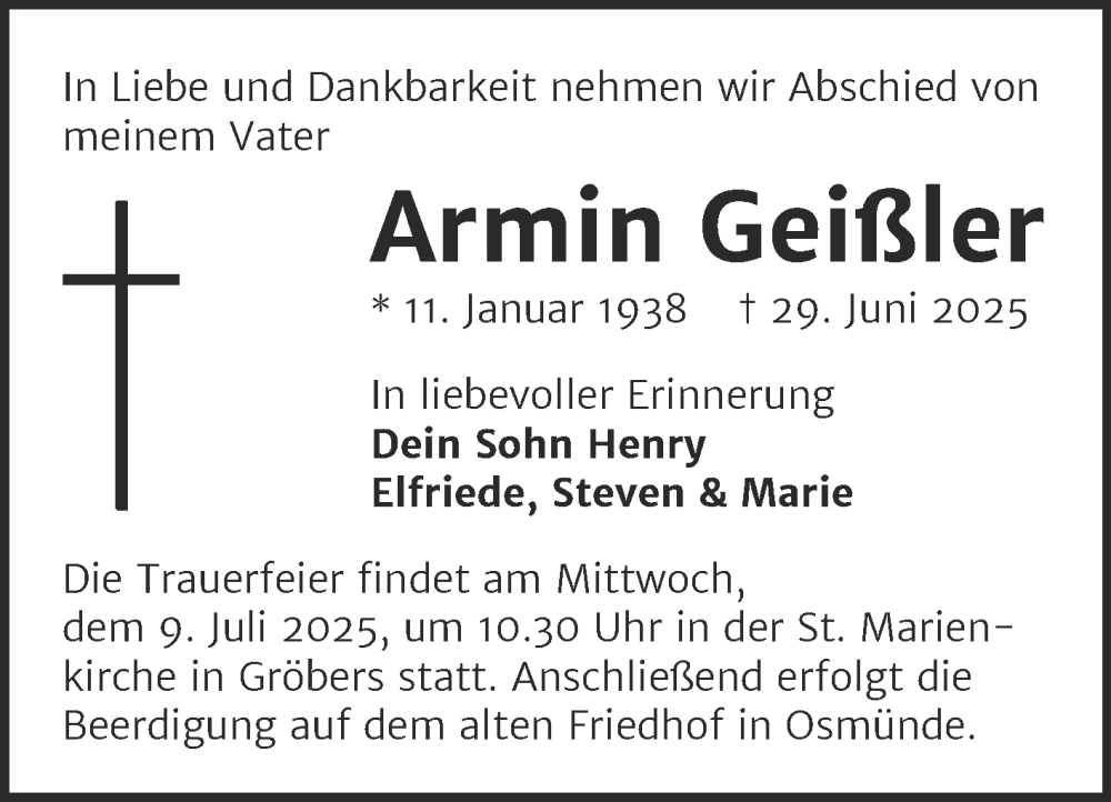 Hier finden Sie alle Traueranzeigen aus der Zeitung, die bisher für Armin Geißler erschienen sind. Weitere Traueranzeigen, die in der Zeitung erscheinen, werden hier ebenfalls aufgelistet