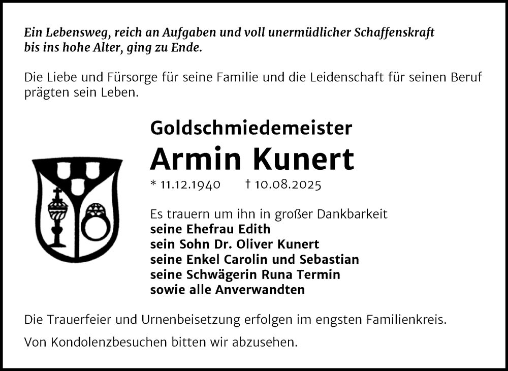 Hier finden Sie alle Traueranzeigen aus der Zeitung, die bisher für Armin Kunert erschienen sind. Weitere Traueranzeigen, die in der Zeitung erscheinen, werden hier ebenfalls aufgelistet