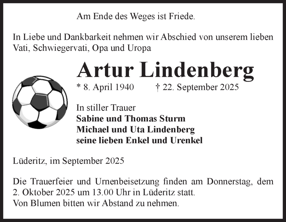 Hier finden Sie alle Traueranzeigen aus der Zeitung, die bisher für Artur Lindenberg erschienen sind. Weitere Traueranzeigen, die in der Zeitung erscheinen, werden hier ebenfalls aufgelistet