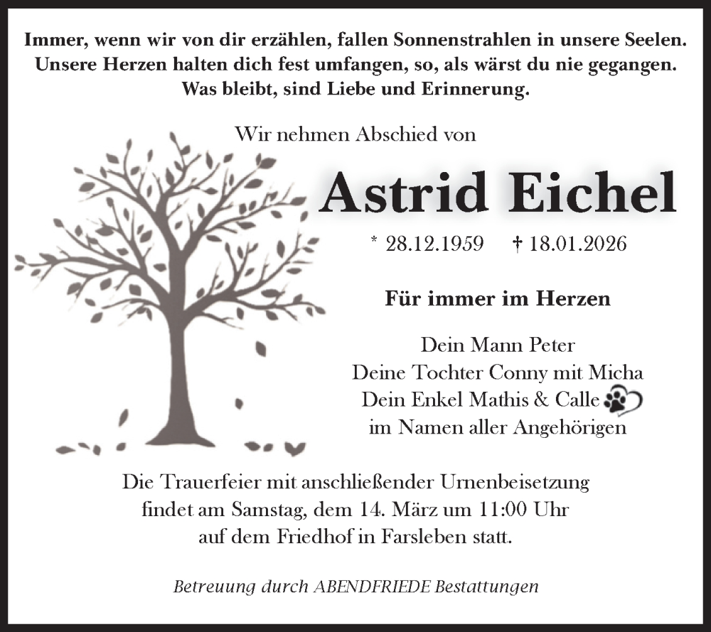 Hier finden Sie alle Traueranzeigen aus der Zeitung, die bisher für Astrid Eichel erschienen sind. Weitere Traueranzeigen, die in der Zeitung erscheinen, werden hier ebenfalls aufgelistet