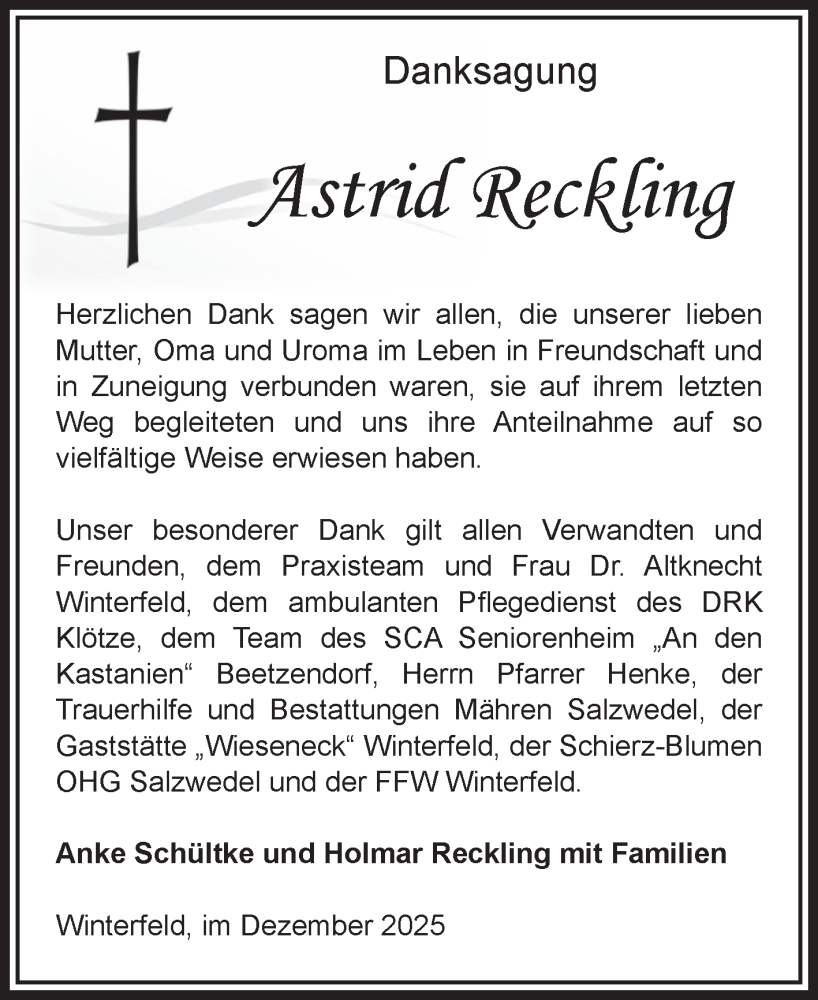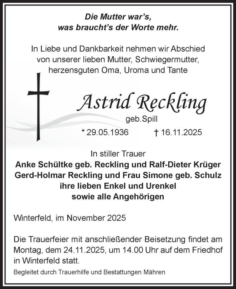 Hier finden Sie alle Traueranzeigen aus der Zeitung, die bisher für Astrid Reckling erschienen sind. Weitere Traueranzeigen, die in der Zeitung erscheinen, werden hier ebenfalls aufgelistet