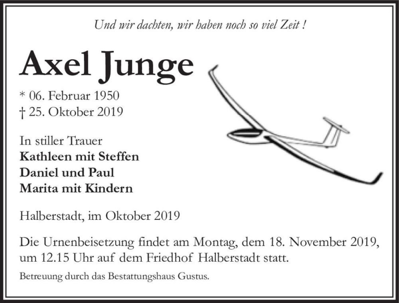 Hier finden Sie alle Traueranzeigen aus der Zeitung, die bisher für Axel Junge erschienen sind. Weitere Traueranzeigen, die in der Zeitung erscheinen, werden hier ebenfalls aufgelistet
